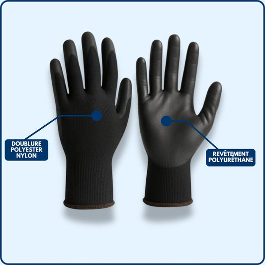 Le revêtement en polyuréthane, quant à lui, est la signature de ces gants. Il confère une adhérence optimale, une résistance élevée à l’abrasion et une imperméabilité partielle face aux huiles et micro-liquides. Ce revêtement fin garantit une dextérité maximale, essentielle dans les métiers où la précision du geste prime : électriciens, manutentionnaires, mécaniciens, ou encore artisans du BTP.