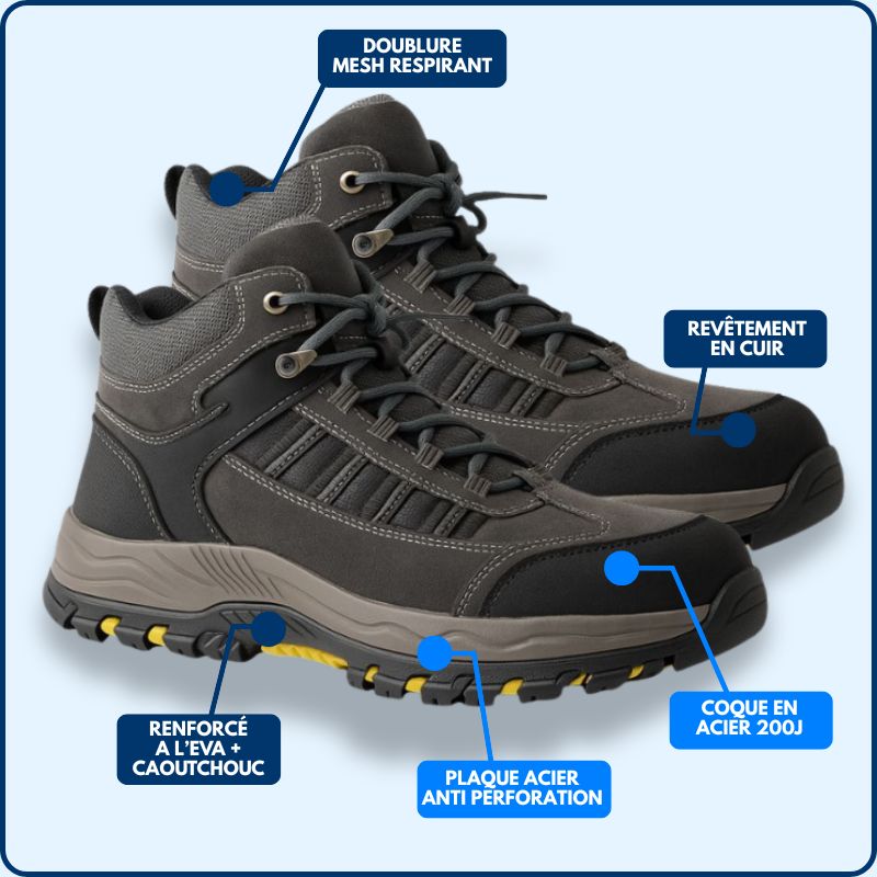 🥾 Protection maximale sur le terrain : grâce à son embout en acier et sa plaque anti-perforation, cette chaussure garantit une sécurité totale contre les chocs, les chutes d’objets ou les clous au sol. Conforme à la norme EN ISO 20345:2011 S3.